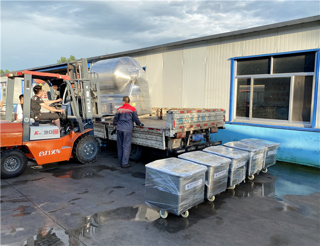 800L變頻水冷真空滾揉機(jī)1臺(tái),200L料車5臺(tái),發(fā)往沂水