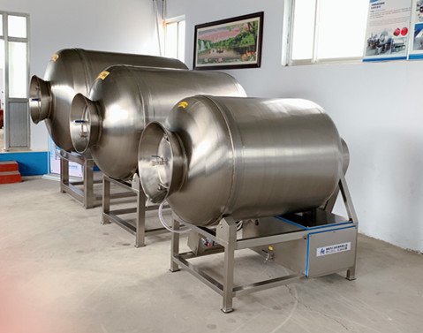 一、裝料: 開啟真空泵,使?jié)L筒內(nèi)壓力達(dá)到-0.08Mpa后停止運(yùn)行真空泵,同時(shí)將料車放置在機(jī)器前部,將吸料管連接在機(jī)器上,另端放在料車底部,打開吸料閥,肉料吸入滾筒,完成裝料工作。