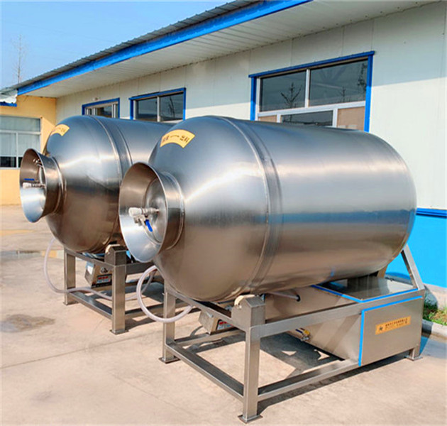 大家都看到啦,真空滾揉機的外形就跟建筑工地上的水泥攪拌罐一樣的造型。這就是說真空滾揉機的一個作用就是起到攪拌、均勻的效果。也就是把肉、輔料、水按照比例加好之后放進真空滾揉機攪拌均勻。