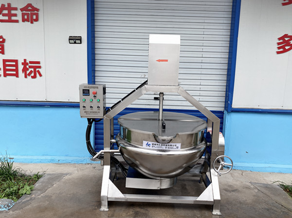 鍋體為一次沖壓成型的半球形不銹鋼鍋體,攪拌方式采用特殊的傾斜式傳動(dòng),根據(jù)行星運(yùn)動(dòng)原理研制而成,使攪拌器與鍋體充分接觸,實(shí)現(xiàn)傳動(dòng)公轉(zhuǎn)與自轉(zhuǎn)的不整數(shù)傳動(dòng)比,鍋內(nèi)無(wú)攪拌死角.同時(shí)具有不粘鍋te性.非常適加工辣椒醬,火鍋底料熬制等高粘稠物料的加工。而且傾倒的時(shí)候有全自動(dòng)液壓裝置,不需要人工手搖圓柄之類(lèi)的,只需要輕輕的摁一下按鈕即可進(jìn)行全部操作。